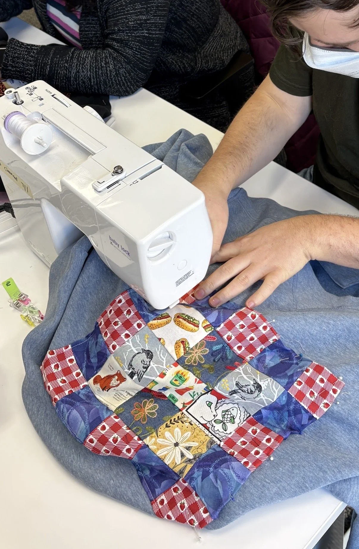 Learn how to use a sewing machine and apply that to an upcycling project on a sweater with a patchwork panel.